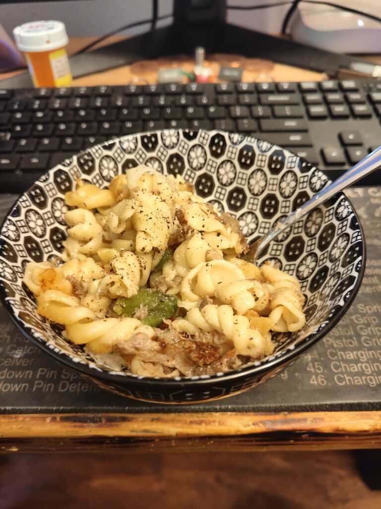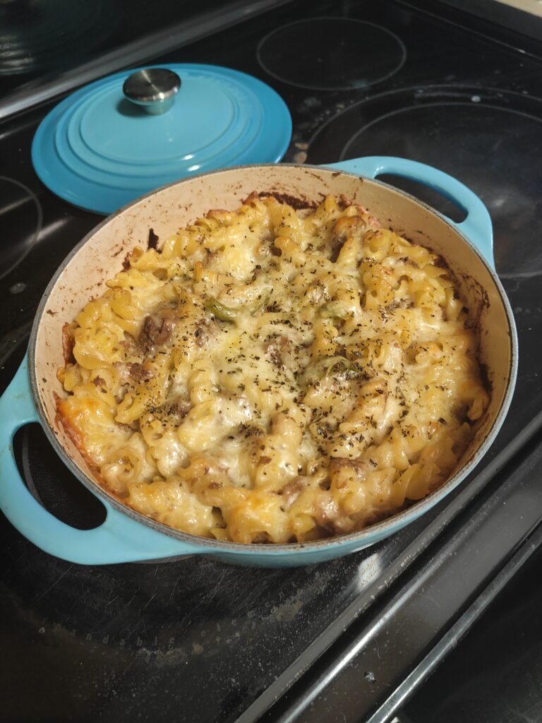 I mean I made this meal up… there might be something similar out there, as after all… the food on this planet has been pretty much the same for the past 40-6,0000 YEARS so at best, mine is a variation on a theme. Said theme being “Throwing meat, pasta, veggies and cheese into a pot and baking it”