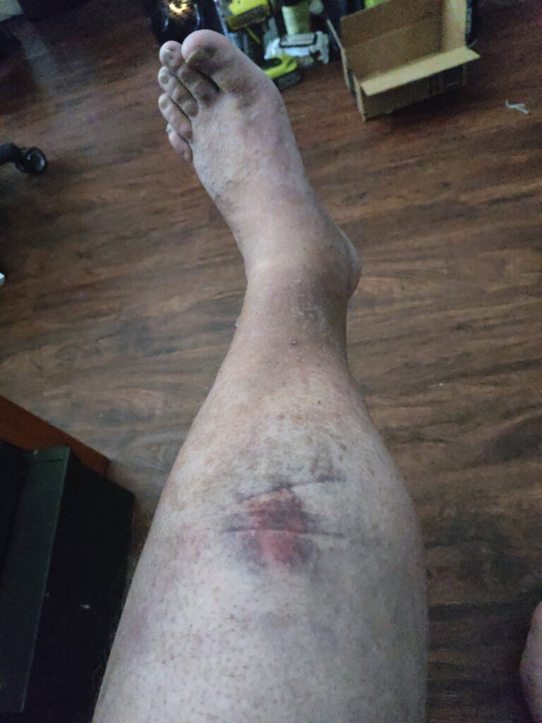 Believe it or not, it’s not that bad. Bad Lighting doesn’t help. The bruising however? Yep. Almost “All American” in that it’s Red White and Blue as well as Purple and Black in some areas. Also it turns out that lil zit on the leg? That right there was a piece of metal that it would seem got ‘worked loose’ beneath he skin… the reason I know this was I took a big ‘fishing magnet’ I have, and it pulled that sucker right out to the surface. So now it’s all good. These things happen every few years…