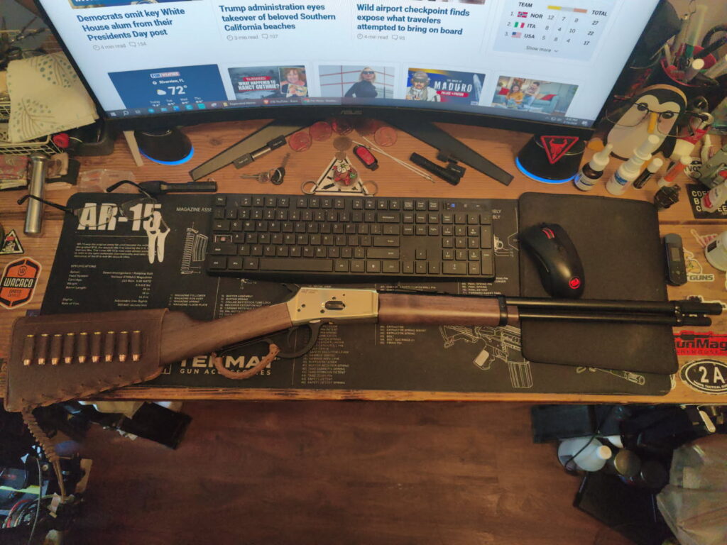 And as you can see, I added quite a few ‘bells and whistles’ to mine. The aforementioned bayonet mount, a 3-D printed barrel heat shield, a Holosun Shotgun sight, plus a tritium front site post, (‘cos “night” and all that) as well as a removable (velcro) side-saddle reload point. There’s also a Surefire M-600 flashlight on the left side. Oh! I also forgot, but it has a LARGE bolt release paddle added as well (the BIG piece of sheet steel near the feed ramp by the grip) which doesn’t replace the itty bitty button, but rather augments it.