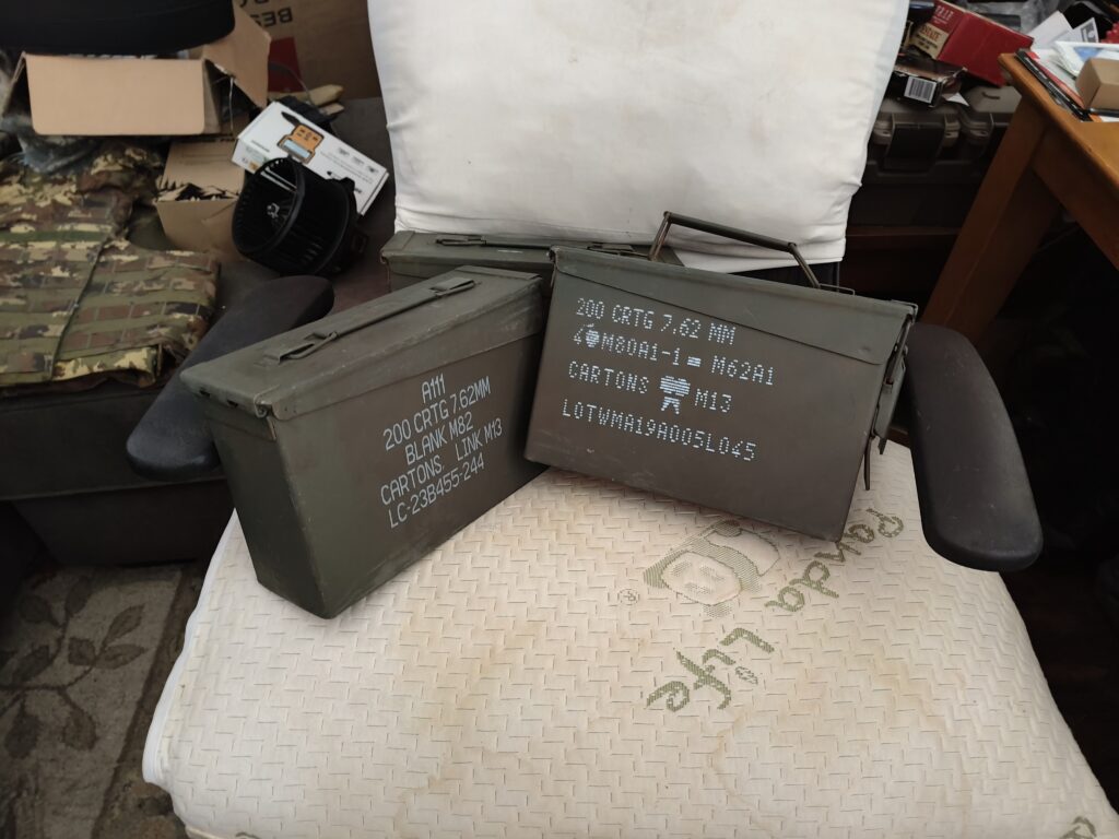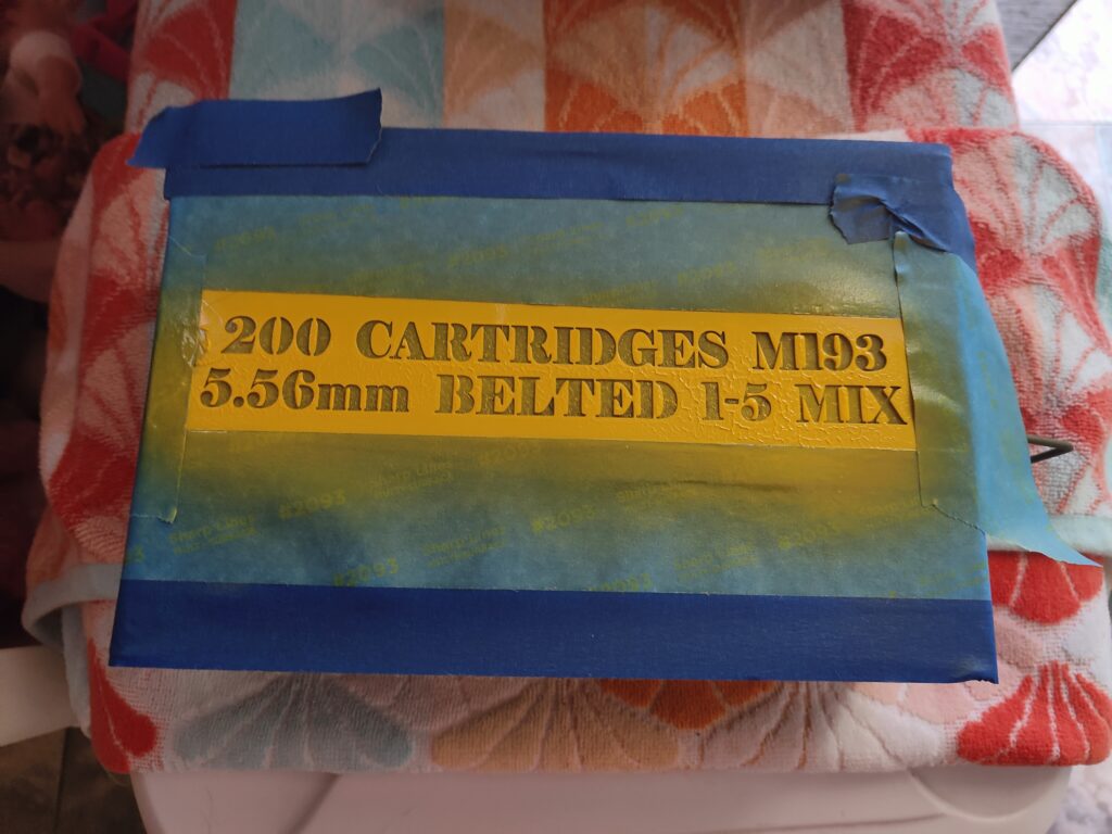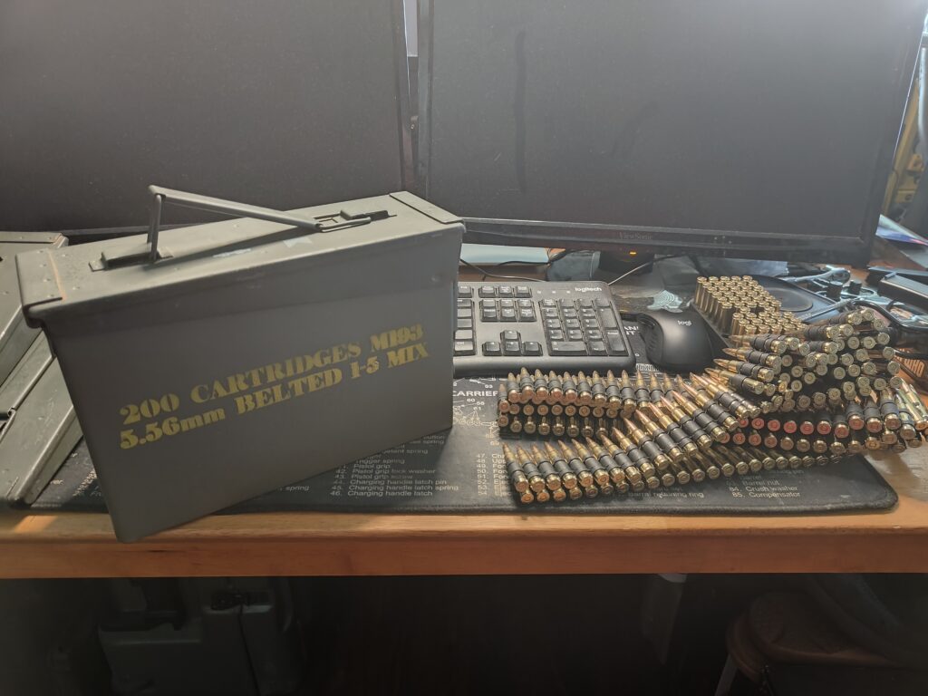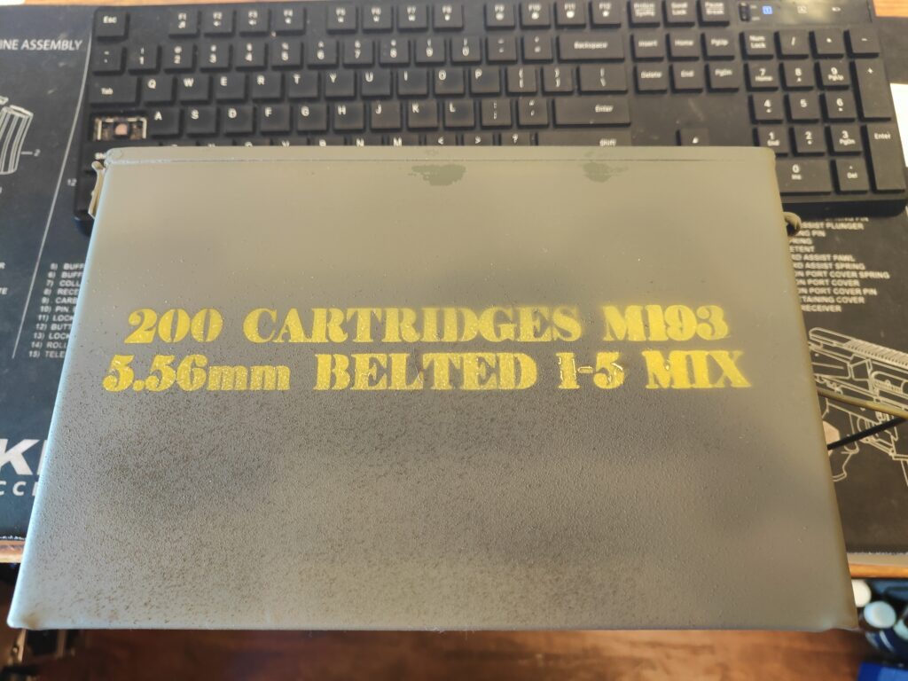 I realized I wanted some ammo cans to stash the SAW belts in. SO I got a 4-pack of what are most commonly referred to as “M-60 ammo cans”… the correct nomenclature being the M19A1. They were about $15 a piece, but with the coupon and free shipping, it worked out to $12 a can.