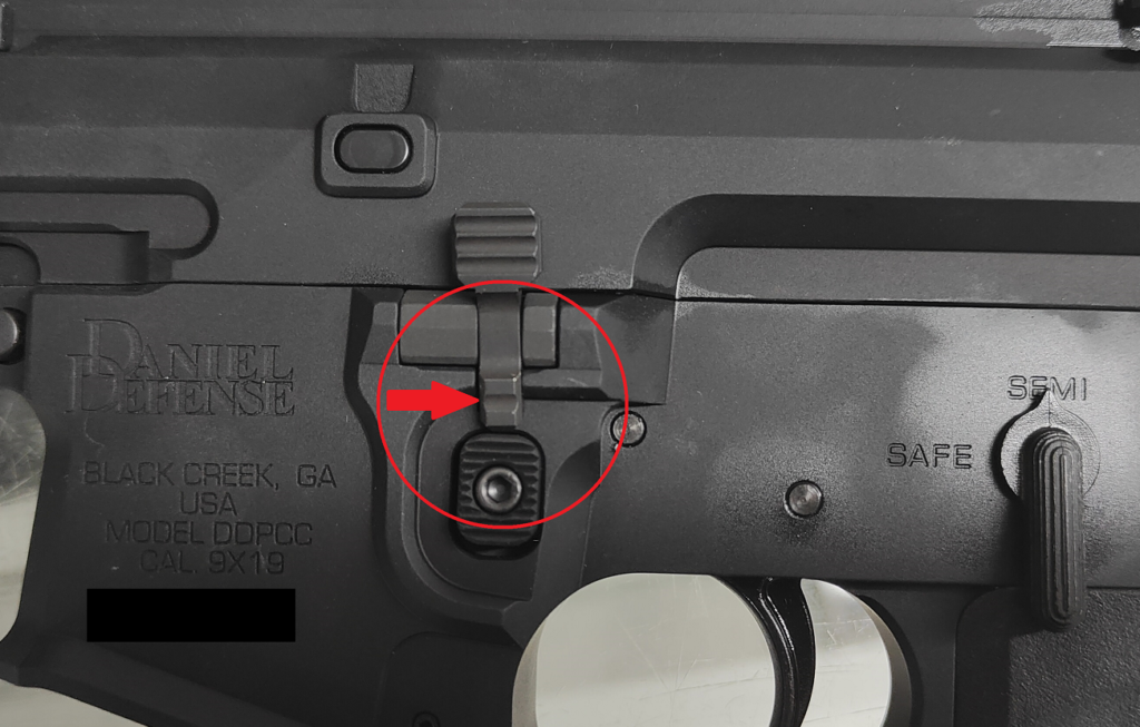 So… let me explain here. It’s got an ambidextrous mag release, as well as a bolt catch/release. If you’ll notice, to ‘lock the bolt to the rear’ you have to pretty much push down on the bottom part of the release, as I have circled here: