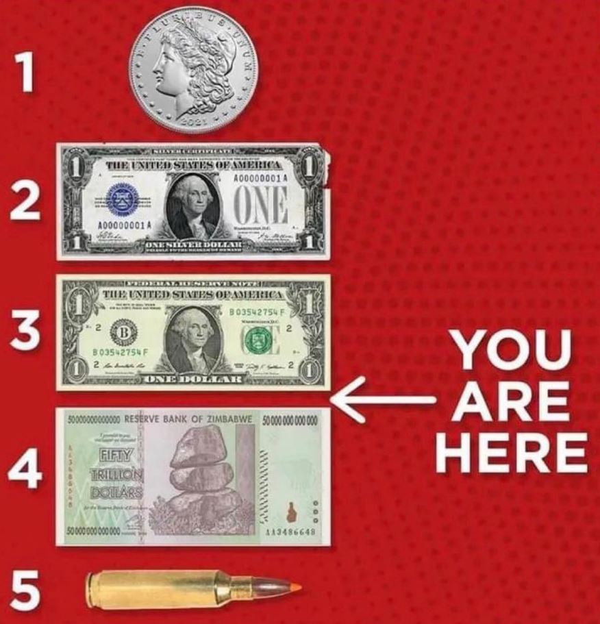 You can’t eat it, and it might be worth something in trade, but in reality? Silver and Gold only hold value as long as there’s something of value you can exchange it for… and TBH, depending on what you’re bartering for, a Loaf of Bread and a Gallon of milk might be worth that One Ounce coin IF fiatbux become Weimar Script or like Zimbabwe, where they drafted One Hundred Trillion Dollar notes: