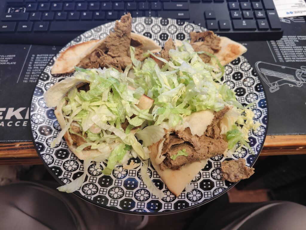 I mixed up the ded anin-i-mal flesh with the ‘proper’ seasoning(s) I -usually- use, and then instead of using skewers, I put the meetz on parchment paper and rolled that shit thin AF. Like LITERALLY used my OMG awesome rolling pin to roll it out to between 1-2mm thick…. The meat was SAMMICHED between two pieces of the parchment paper when I rolled it flat BTW, which prevented meetz contamination of what would usually be a baking-only rolling pin…